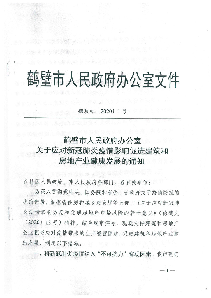 鶴壁市人民醫(yī)院政府辦公室文件關(guān)于應(yīng)對新冠肺炎疫情影響促進(jìn)建筑和房地產(chǎn)業(yè)健康的發(fā)展通知