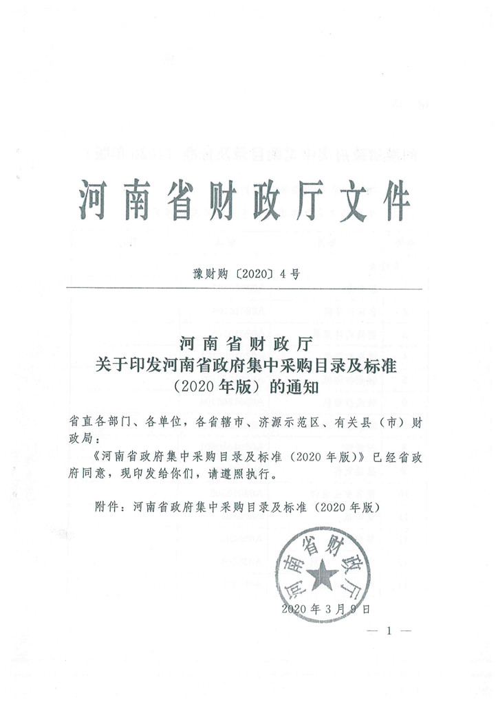 河南省財(cái)政廳關(guān)于印發(fā)河南省政府集中采購(gòu)目錄及標(biāo)準(zhǔn)(2020年版)的通知